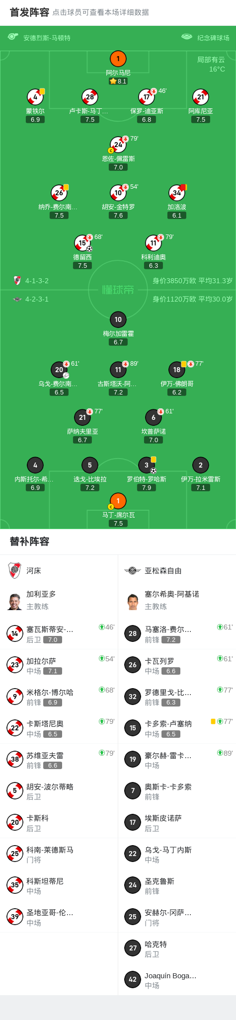 北京时间8月22日南美解放者杯 1/8决赛次回合,河床对阵亚松森自由。河床德留西破门。亚松森自由罗伯特-罗哈斯破门。最终比分河床 1-1 亚松森自由。两回合总比分河床1-1亚松森自由。精彩瞬间第29分钟,河床球员德留西打入一球。第43分钟,亚松森自由球员乌戈-费尔南德斯助攻罗伯特-罗哈斯打入一球。第52分钟,河床球队加洛波吃到第二张黄牌。球队阵容技术统计...