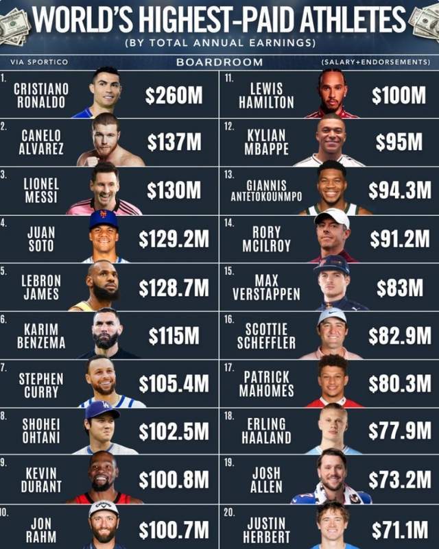 C罗收入暴涨!2.6亿美金领跑运动员排行榜,梅西仅第三!