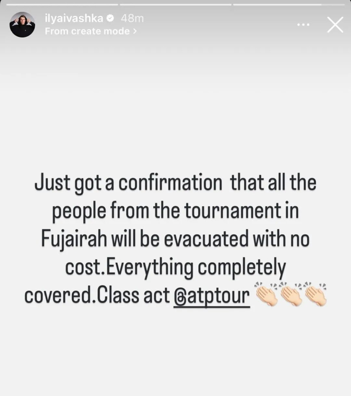 伊瓦什卡更新动态称赞ATP举措令人欣慰的是,这一情况很快迎来转机。参赛选手伊瓦什卡在北京时间昨晚更新个人社交媒体,透露ATP将全额承担所有球员的撤离费用,这意味着身处动荡地区的球员无需再自掏腰包,即可安全离开。